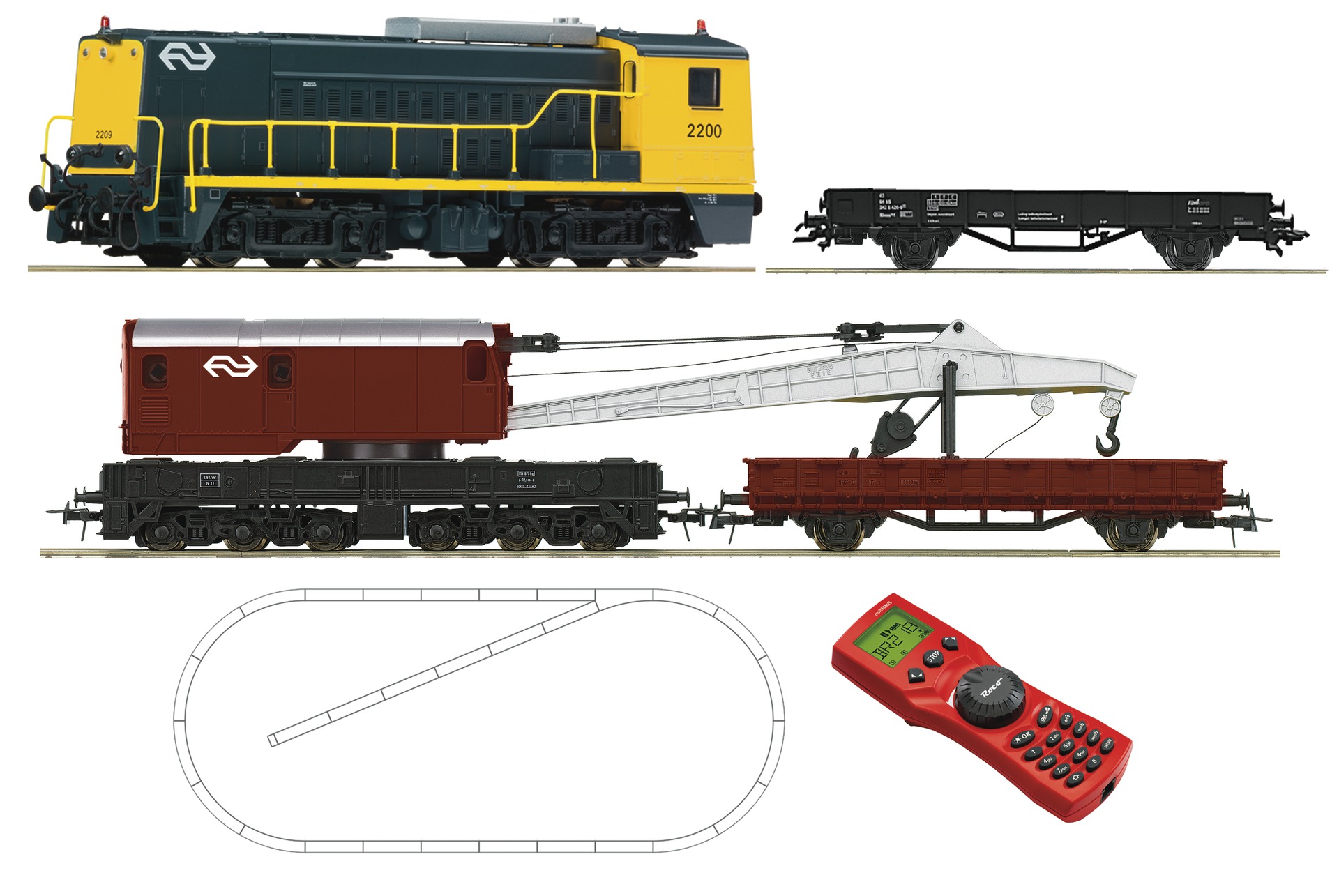 Set contents: Diesel locomotive series 2200 with train that consists of one flat car with railway crane. Roco geoLine track oval that consists of 12 curved tracks R3, 1 preinstalled feed-in element, 17 straight tracks G200, 1 left turnout 22.5, 1 buffer stop and 1 track end piece. 1 manual controller multiMaus, 1 x-bus amplifier and 110V power supply.