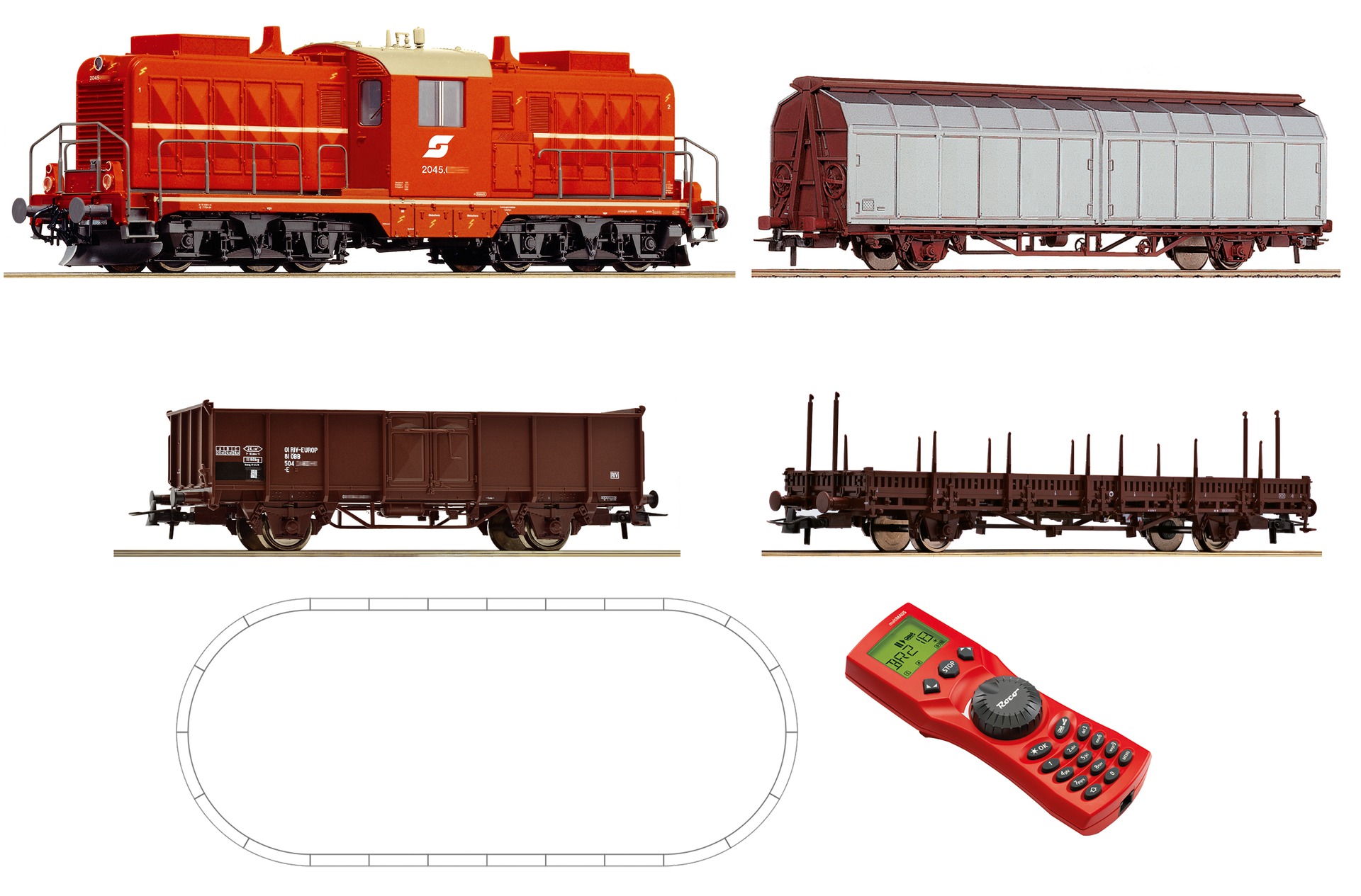 Set consists of 1 diesel locomotive series 2045, ÖBB 1 sliding wall wagon 1 gondola 1 swing stake wagon 1 manual controller multiMaus 1 x-Bus amplifier, 1 plug-in power supply unit 110v Roco geoLine-Gleisoval: 12 Bogen R3, 12 Gerade G200, 1 mit Einspeisungselement.