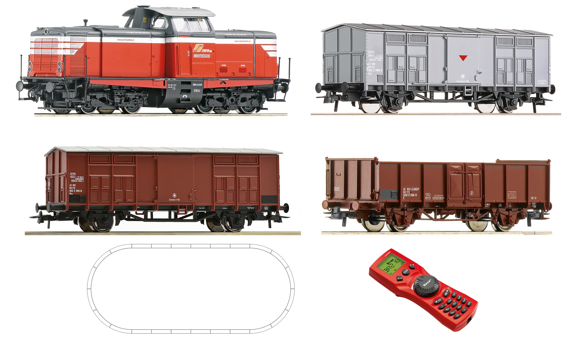 Contents: 1 diesel locomotive K.211, Serfer 1 gondola 2 freight cars 1 manual multiMaus 1 x-Bus amplifier, 1 plug-in power supply unit 110v Roco geoLine track layout: 12 curved tracks R3, 8 straight tracks G200