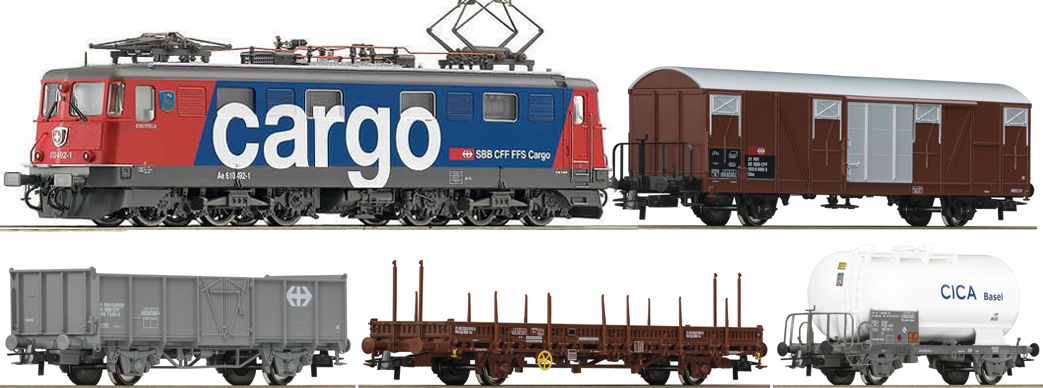 Digital starter set consists of Electric locomotive Re 6/6 in SBB Cargo livery with Digital decoder, 4 Freight cars, large oval of GEO line track with turnout and track bumper, digital multiMAUS, digital amplifier, 110V power supply and user manual.