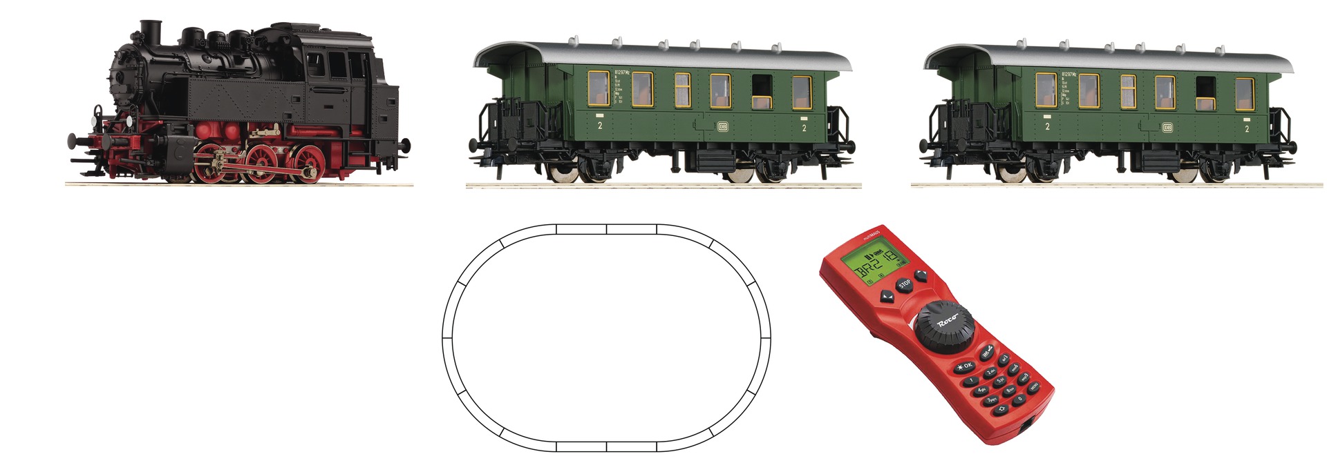 Digital Starter Set with Steam Locomotive BR 80 and Passenger train<br /><a href='images/pictures/Roco/228385.jpg' target='_blank'>Full size image</a>