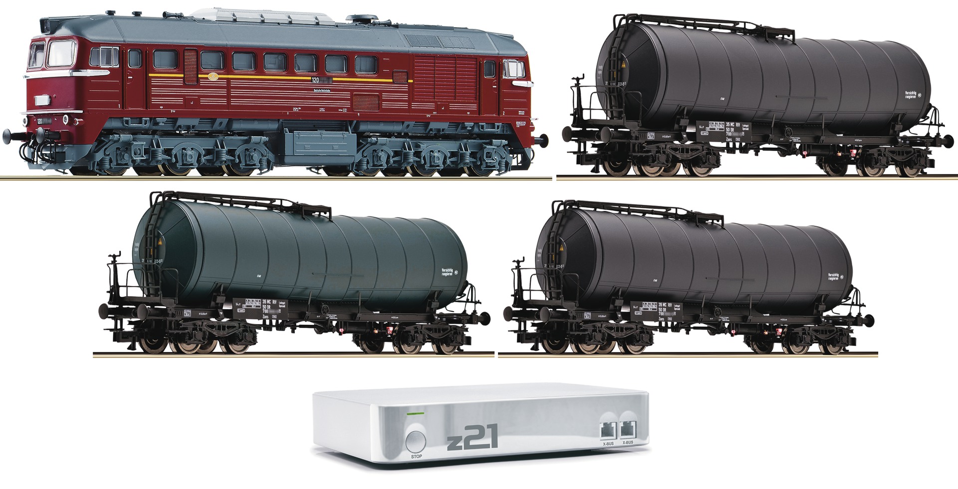 Set consists from: Diesel locomotive BR 120 with Digital decoder, 3 Tank cars, Z21 control system, WLAN router, 110V power supply and user manual. The set does not include any track. This set requires a smartphone or a tablet for operation, not included.