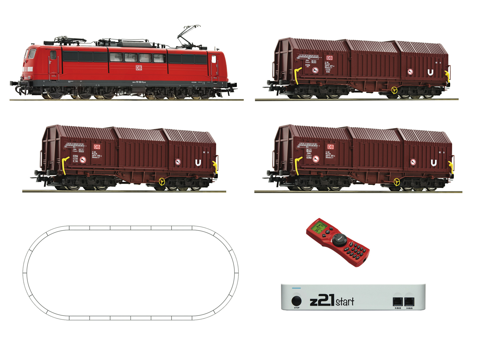 1 Diesel locomotive BR 151, DB AG 3 telescopic hood wagons 1 z21start, 1 plug-in power supply unit 110V, 1 manual controller multiMaus Roco geoLine track layout: 12 curved tracks R3, 12 straight tracks G200