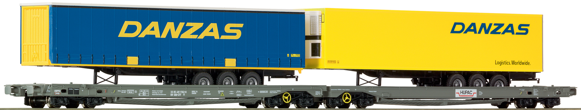 Double unit rolling road Flat car HUPAC with 2 trailers Danzas