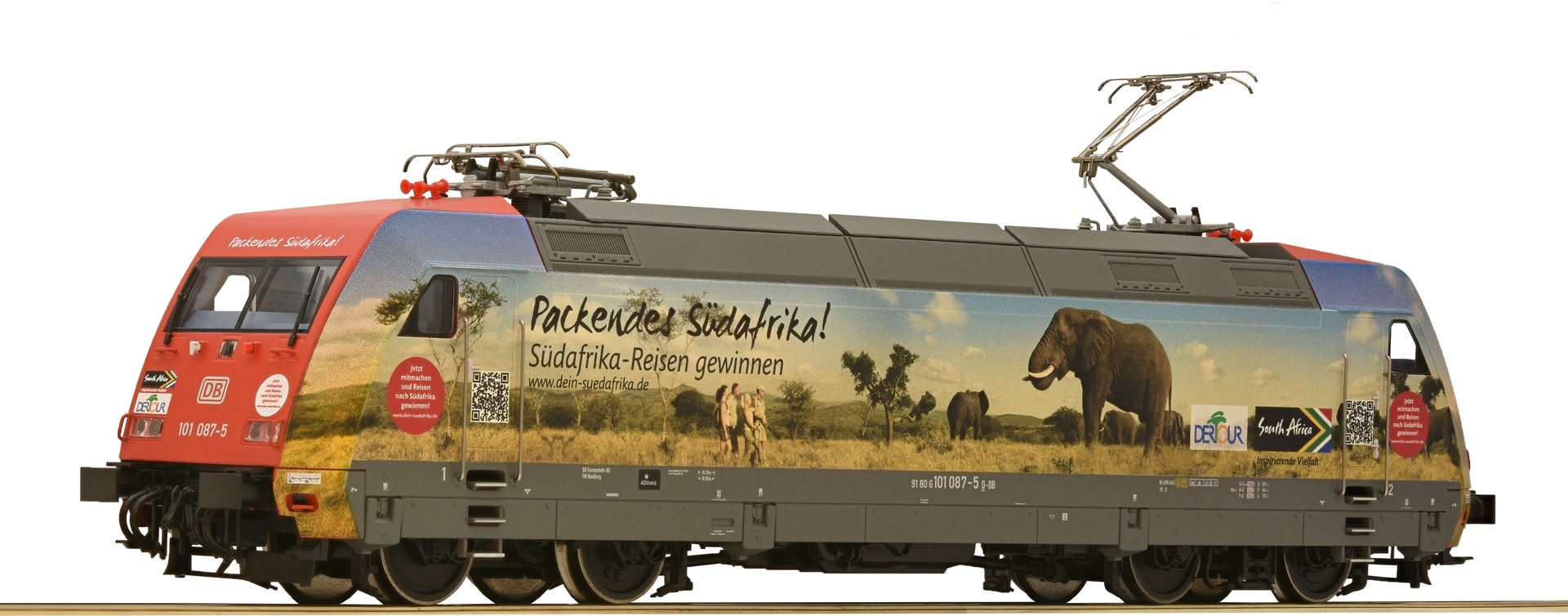 Version in "Elephant Walk" design of the travel agency Dertour from the promotional locomotive series "Packendes Südafrika" "Exciting South Africa". Motor with flywheel. Drive on all four axes. Two wheels feature traction tyres to increase traction force. White/red triple headlight that changes with the direction of travel. Coupler pocket according to NEM 362. LED lighting. PluX-22 digital interface.