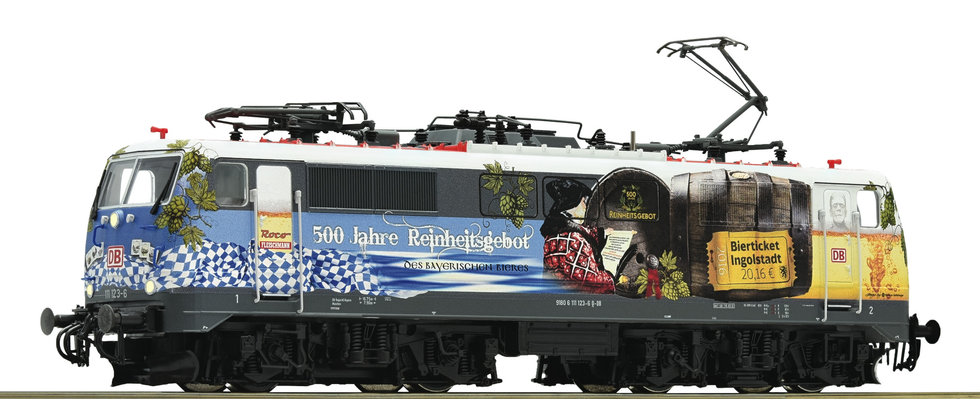 Motor with flywheel. Drive on 4 axes, 2 wheels have traction tyres. Standard NEM 362 coupling socket. Triple headlights white/red at each end, coordinated with direction of travel.