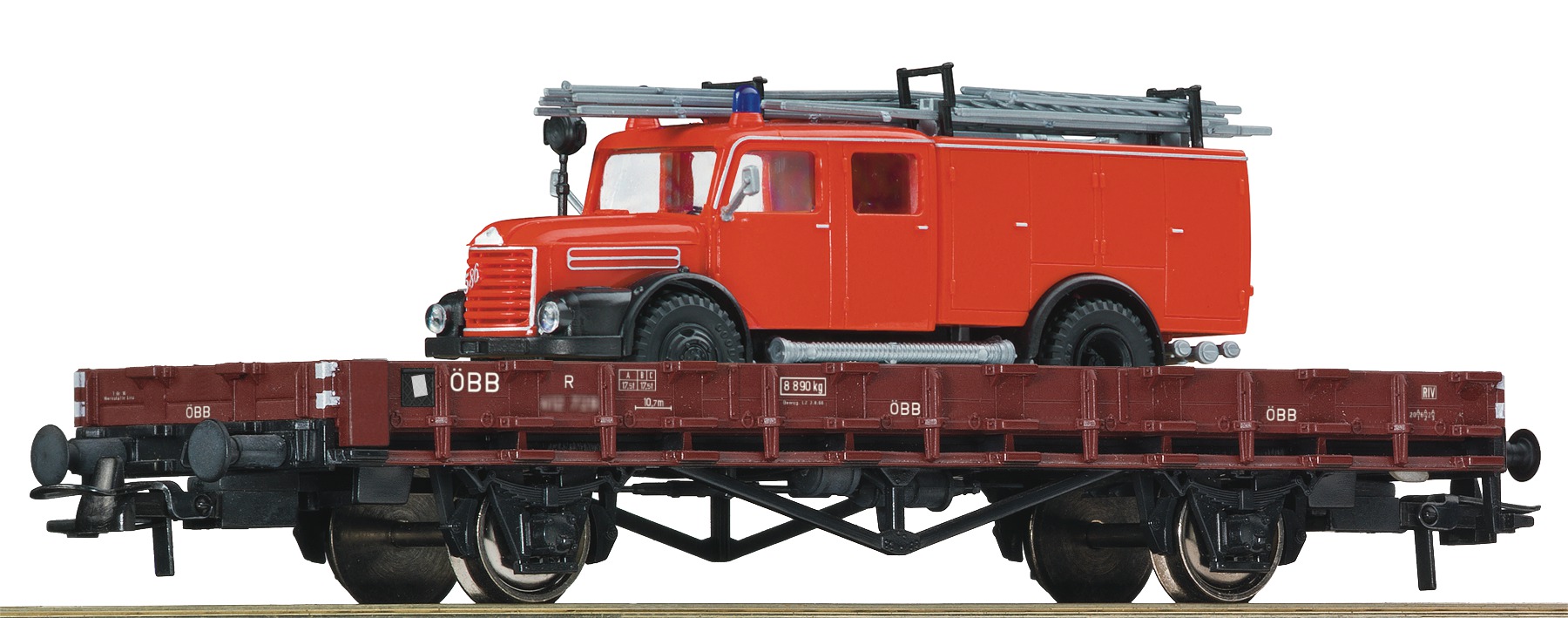 67268: FLAT CAR LOADED WITH FIRE TRUCK STEYR 586