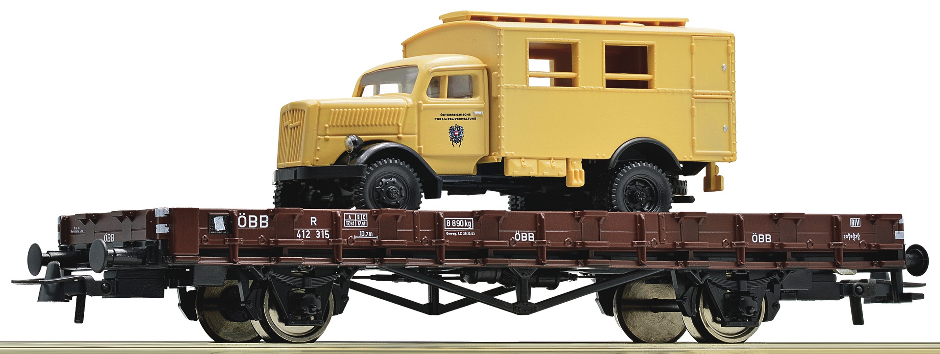 Flat car loaded with Mail truck Opel Blitz