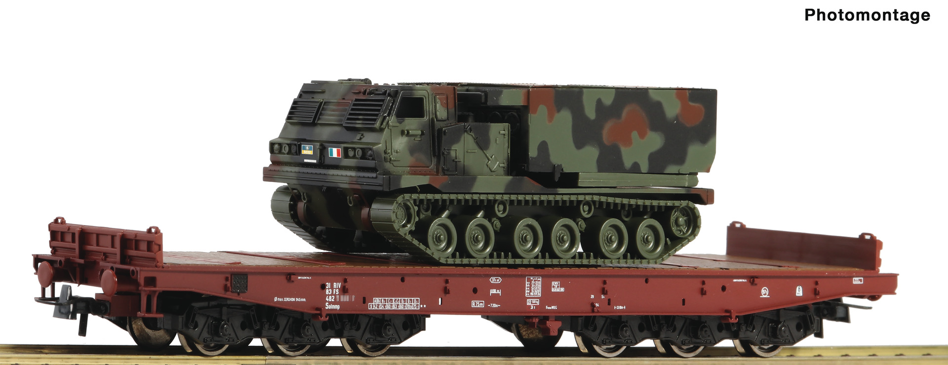 76954: HEAVY DUTY FLAT CAR LOADED WITH ITALIAN ARMY MARS/MLRS 270