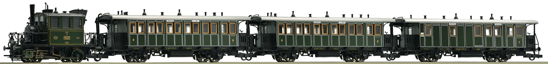 Authentic train set of the Royal Bavarian State Railways that consists of one steam locomotive Ptl 2/2 nicknamed Glaskasten with digitally switchable sound functions, two branchline passenger cars and one branchline car with mail compartment. Glaskasten Ptl 2/2 with sound functions for the first time ! In premium quality exclusive packaging. 5-pole engine. Drive on two axes. NEM 362 coupler pockets. Wagon with close coupler motion link.