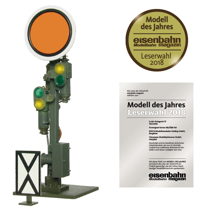 With filigree brass mast, authentic varnishing, printed signal disk, bulb and under baseboard drive unit. Integrated main switching contacts arrange authentic stop. Next main signal shows stop. Signal pictures Vr0 and Vr1.
