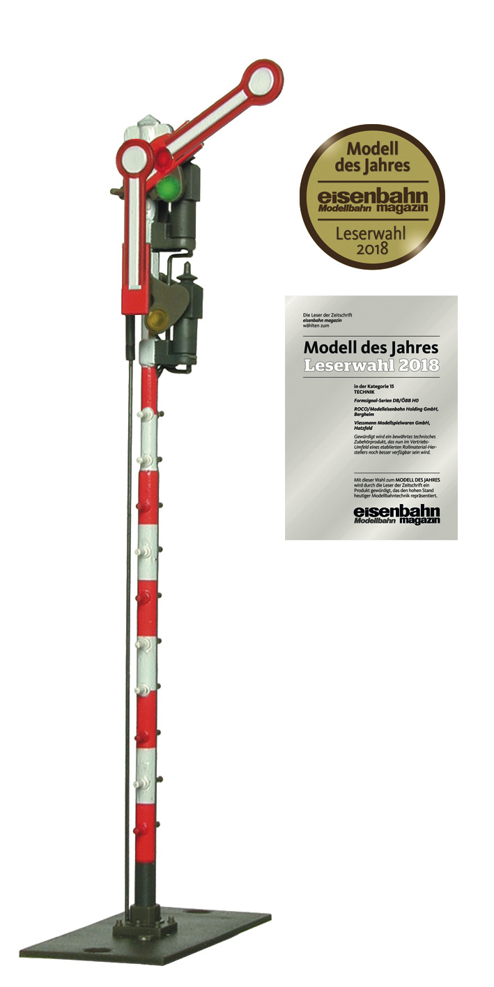 With filigree runged, round brass mast, authentic varnishing, 2 printed signal arms, bulbs and 2 under baseboard drives with integrated train control. Signal pictures Hp0, Hp1 and Hp2.
