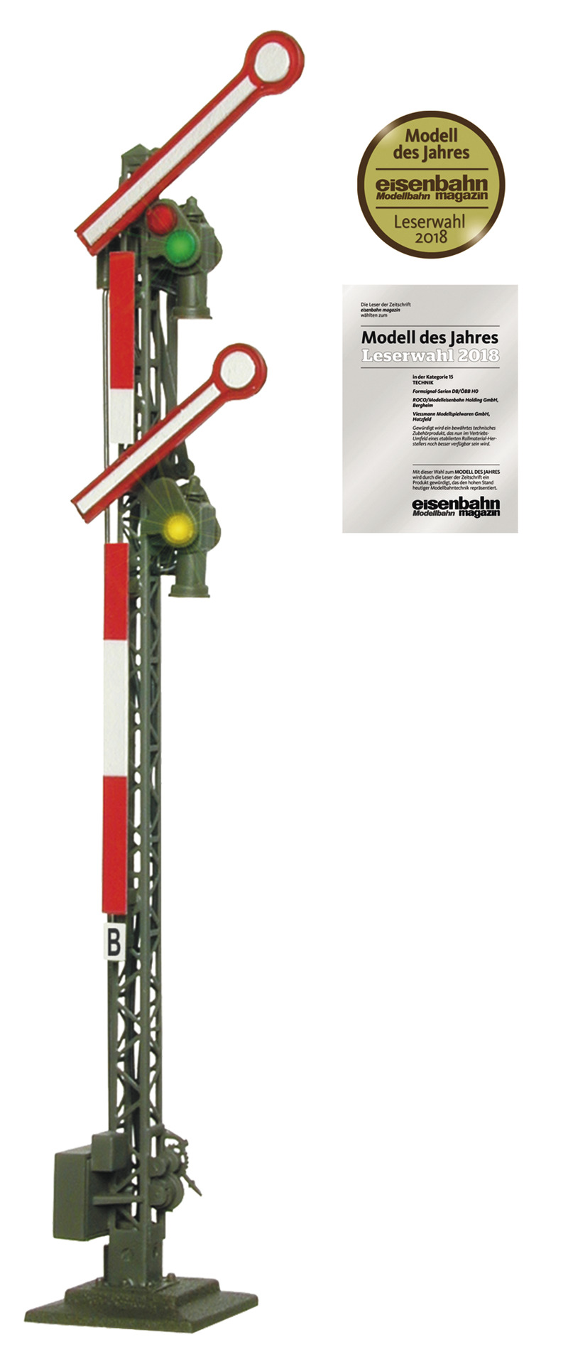 With filigree latticed brass mast and authentic varnishing, printed signal arms and under baseboard drive unit with integrated train control. Maintenance-free due to LED lighting. Signal pictures Hp0 and Hp2.