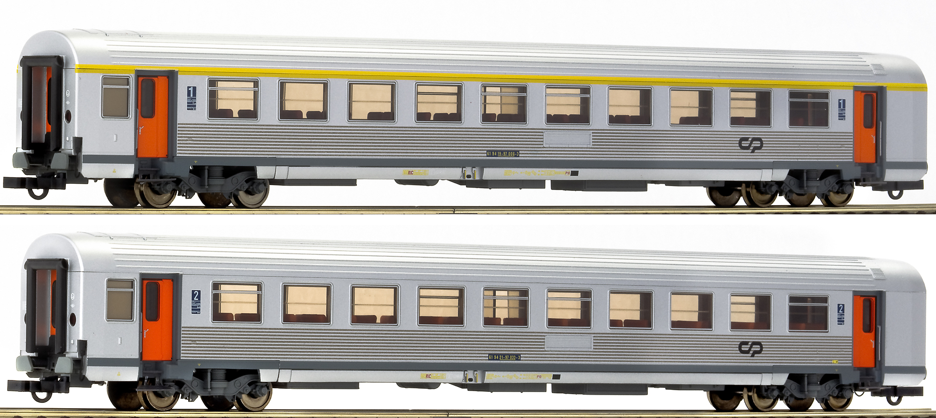 Set of 2 Express train Passenger cars in stainless livery