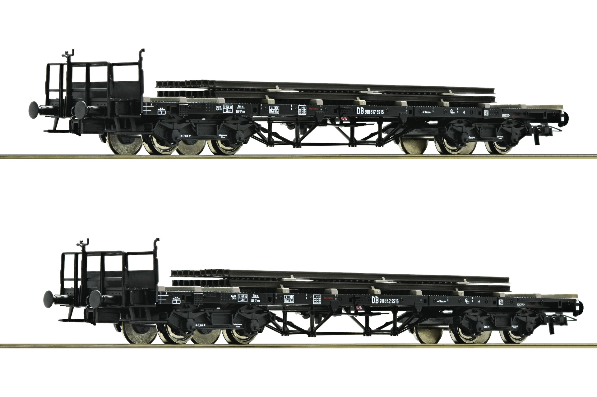 Set of 2 flat cars loaded with Rails