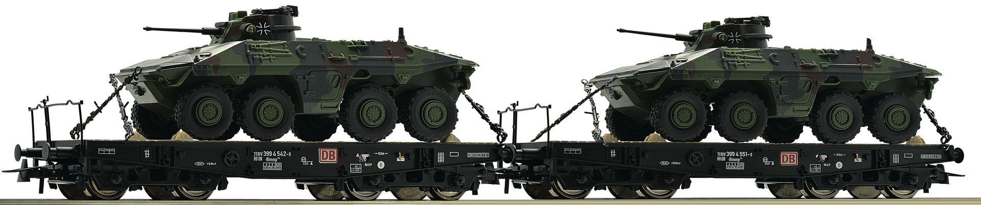 67110: SET OF 2 HEAVY DUTY FLAT CARS LOADED WITH SCOUT TANKS TYPE LYNX OF THE GERMAN ARMY.