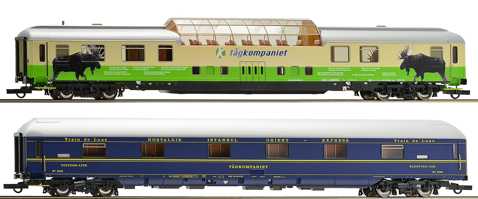 Set consists of one sleeper and one panorama wagon (former Rheingold sight-seeing car). Model true to the original with interior furniture, pre-installed interior lighting. Coupler pockets according to NEM 362 standards and close coupling mechanism.