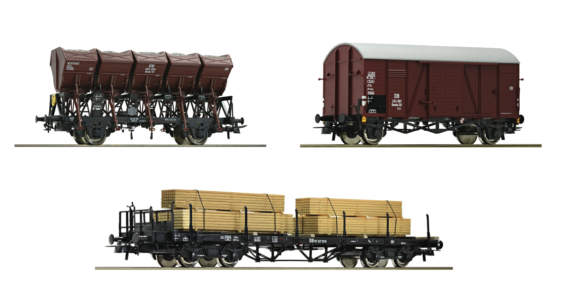The set contains one boxcar, one tipper wagon type Ommi and one stake wagon type SS 15 that carries wood piles. Suitable supplementary item for 76166.