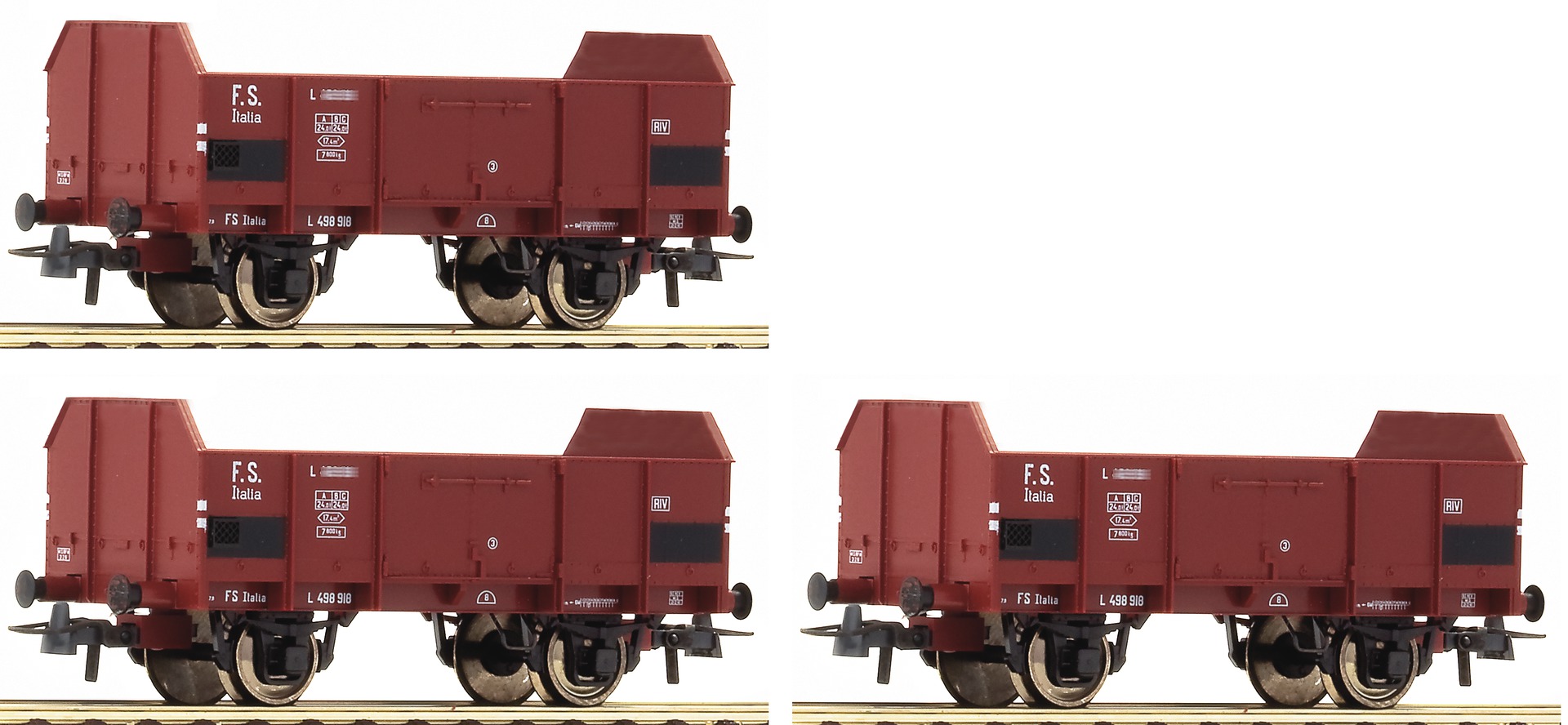The gondolas have different running numbers. Coupler pocket according to NEM 362 standards and close coupling mechanism.