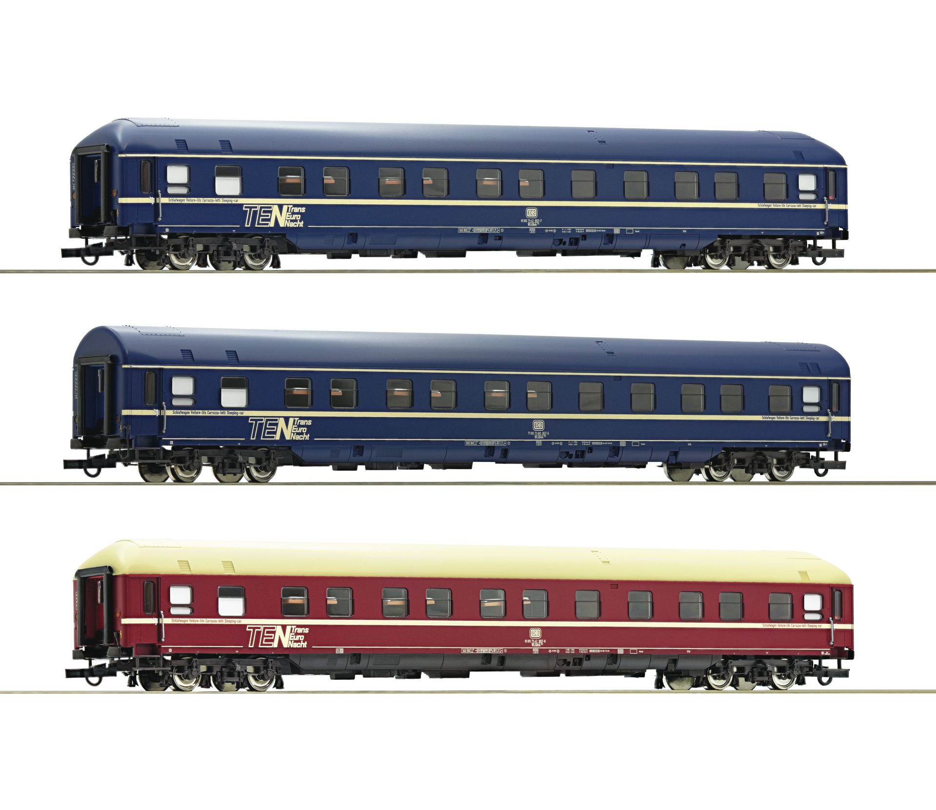 The train set consists of a WLABm 174 in blue livery with round roof, a WLABmh 175 in blue livery and pitched roof and a WLABmh 174 in red livery with beige round roof.