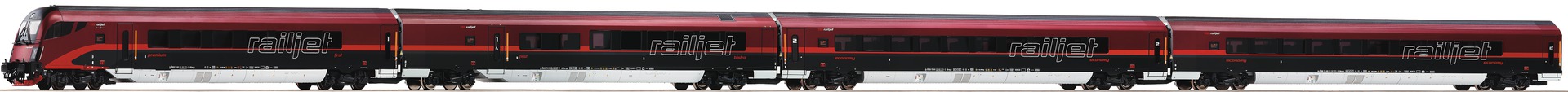 Set consists of two Economy wagons, one buffet wagon with business compartment and one control cab coach with Premium compartment.
