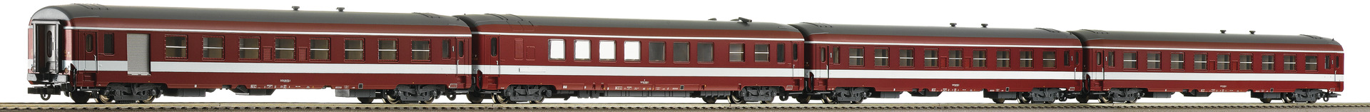 Set consists of 2 passenger cars type A9 ,passenger car with luggage compartment type A7 and restaurant car type Vru.
