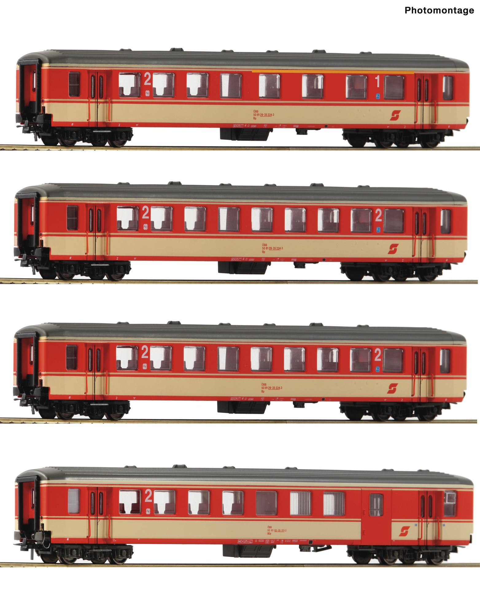 The set contains one 1st/2nd class coach, two 2nd class coaches with different running numbers, and one 2nd class coach with luggage compartment.