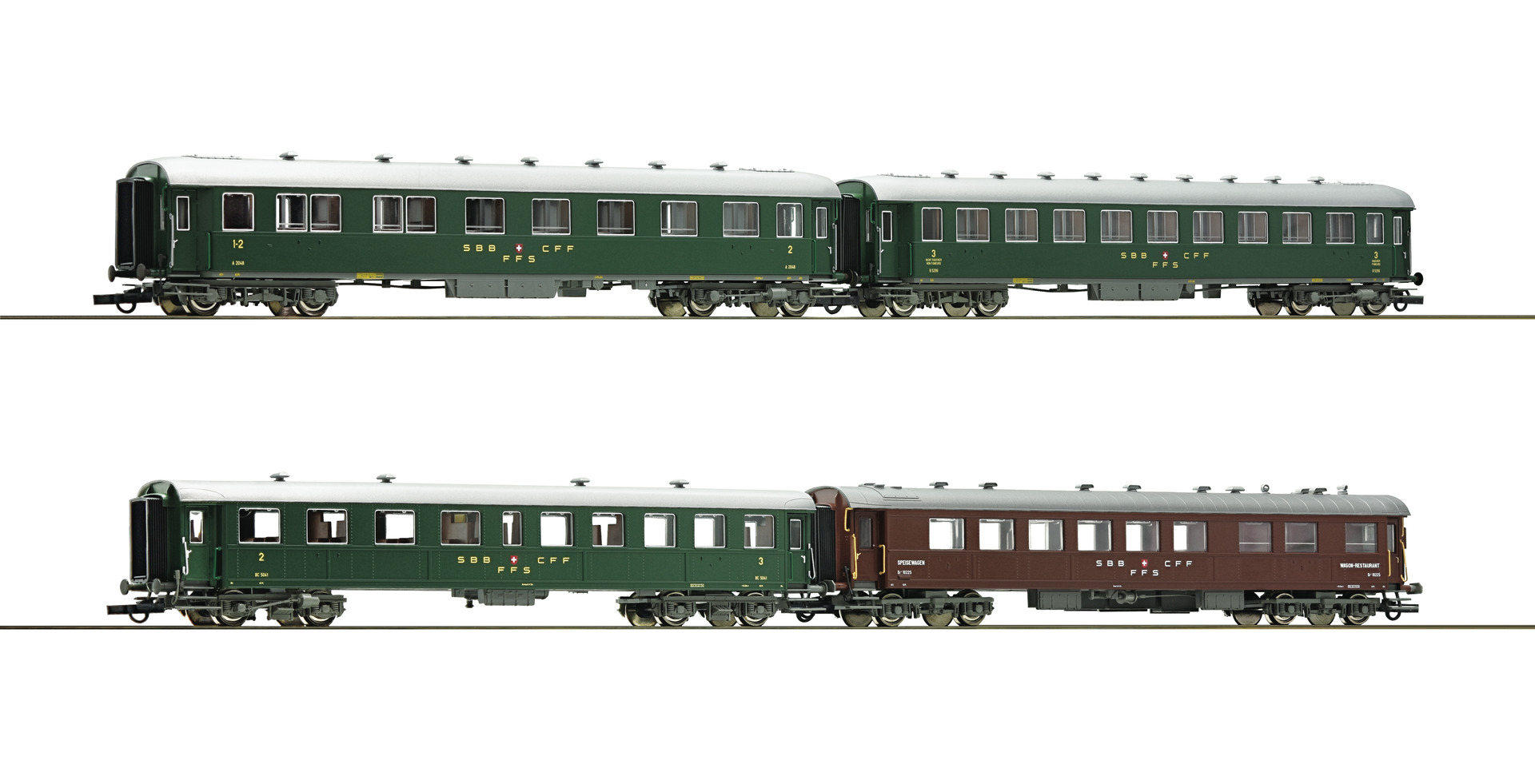 Consisting of a 1st/2nd class Inlandswagen coach, a 2nd/3rd class Inlandswagen coach, a 3rd class Inlandswagen coach and a dining car. Models with interior fittings and ready for installation of interior lighting. Coupler pocket according to NEM 362 standards and close coupling mechanism.