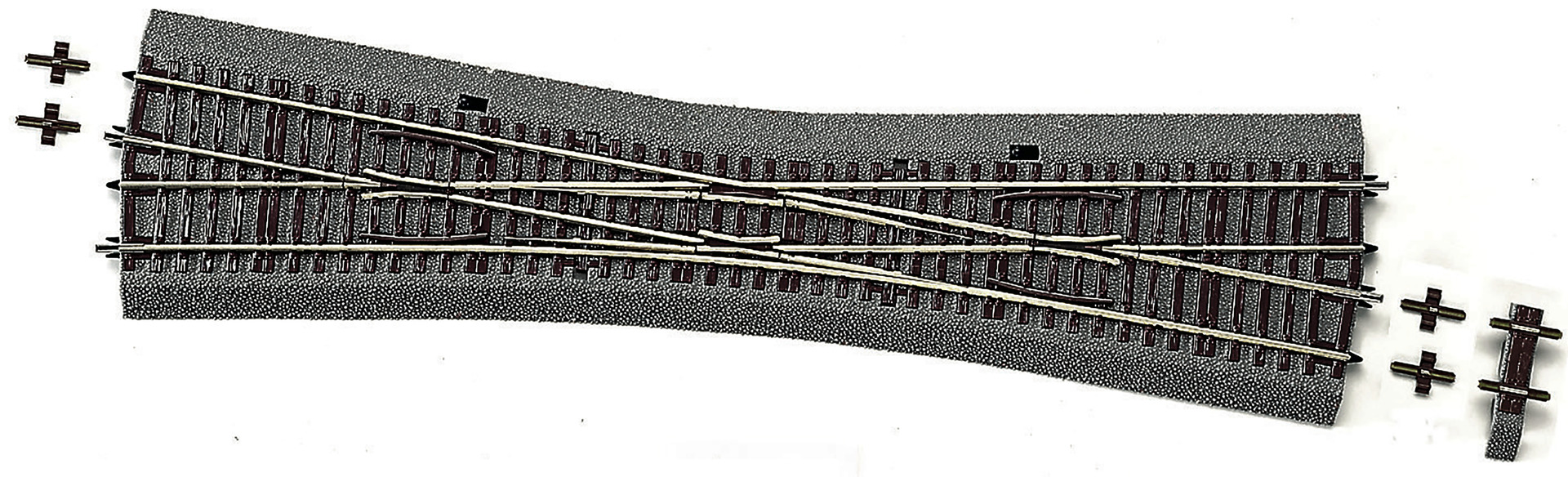 English design with inside tongues, for manual operation, length 345mm,turnout radius 959mm, crossing angle 10 deg. With bedding. Two distancers D2 and D8 are enclosed for length compensation. Matching electric drive 42620 (2x) or 42624 (2x)