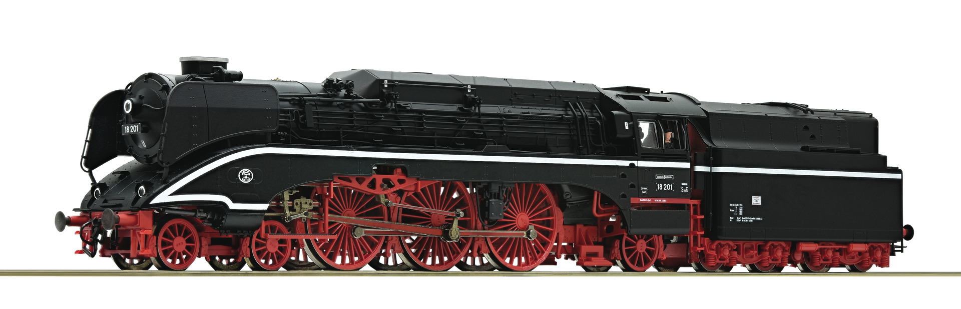 Model in early black livery . Rich detailing on the model with triple headlights. 5 pole motor with flywheel. Traction tyres. Interface according to NEM 652 standards for the adaptation of a decoder. Coupler pocket according to NEM 362 standards on the tender. Model with digitally switchable sound functions Special edition
