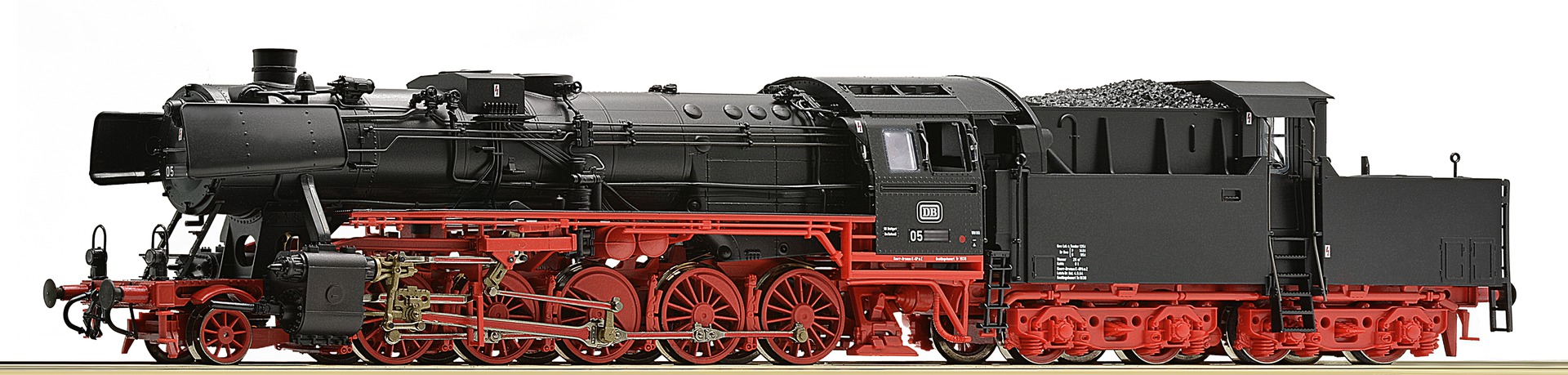 Model equipped with elaborately designed wheel sets and new driving and coupling rods made of cast metal. Motor with flywheel. Drive on seven axes. Two traction tyres. Interface according to NEM 652 standards for the adaption of decoders. Triple LED headlight that changes with the direction of travel. Coupler pocket according to NEM 362 standards and close coupler motion link on the tender.