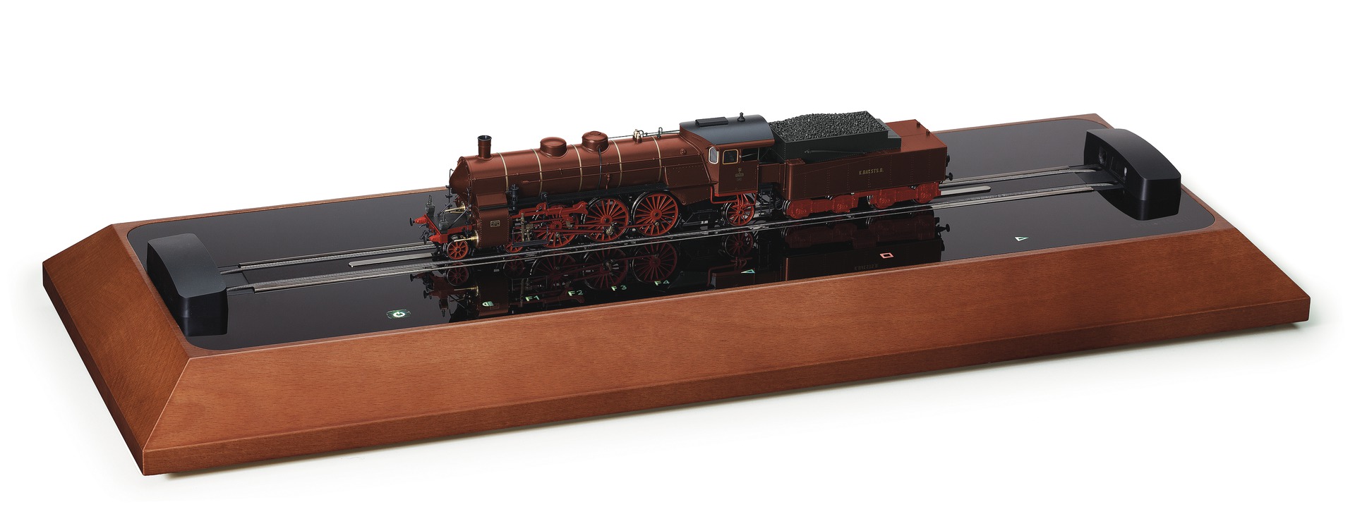 Very rich detailing on the model in attractive brown livery with separately applied plug-in parts. 5-pole engine with mass flywheel, drive on 5 axles, 2 traction tires, NEM 362 coupler pocket with close coupling mechanism on the tender and digitally switchable sound functions. The model is offered in an exclusive wooden case. For the optimal presentation of the model at home or in the office, the locomotive is delivered with innovative smartRail.