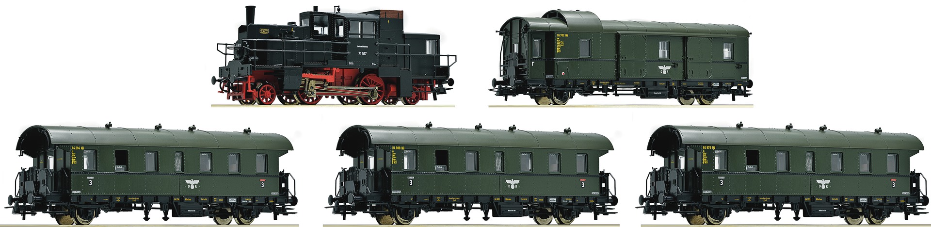 The train set contains one steam rail car series 71.5 of the Deutsche Reichsbahn, one passenger train with three 3rd class Donnerbüchsen wagons and open platforms and one Donnerbüchsen luggage wagon.