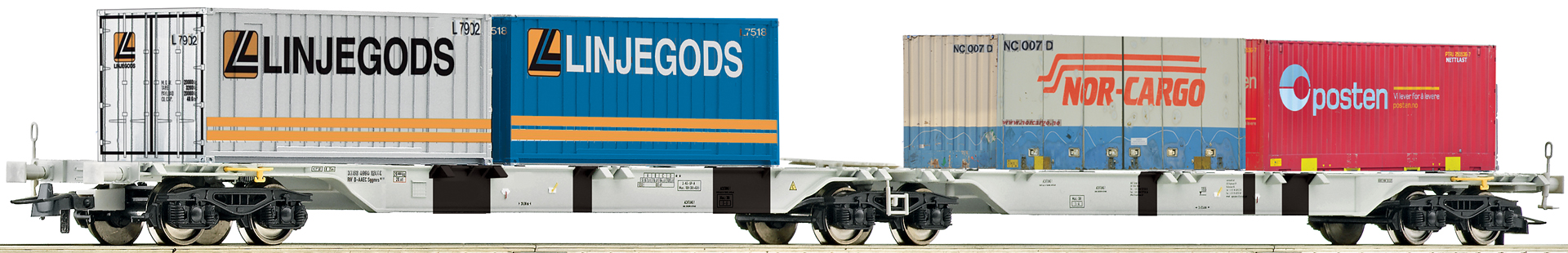 66601: TWIN UNIT FLAT CAR OF AAE LOADED WITH 4 VARIOUS 20' CONTAINERS