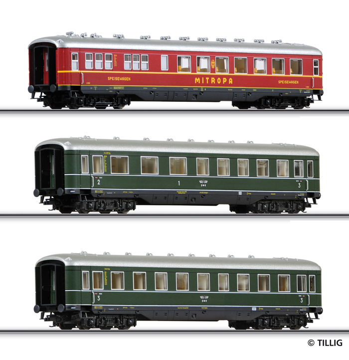 Set consists from Passenger car 1st/2nd/3rd class, Passenger car 3rd class and Restaurant car MITROPA